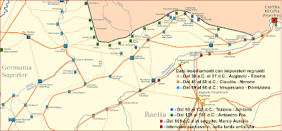 Seguono le immagini della dislocazione del limes germanico-retico con segnalati i tipi di fortificazioni, da cui si evince che l'intero limes era presidiato da fortini delle truppe ausiliarie dell'esercito romano.![]() |